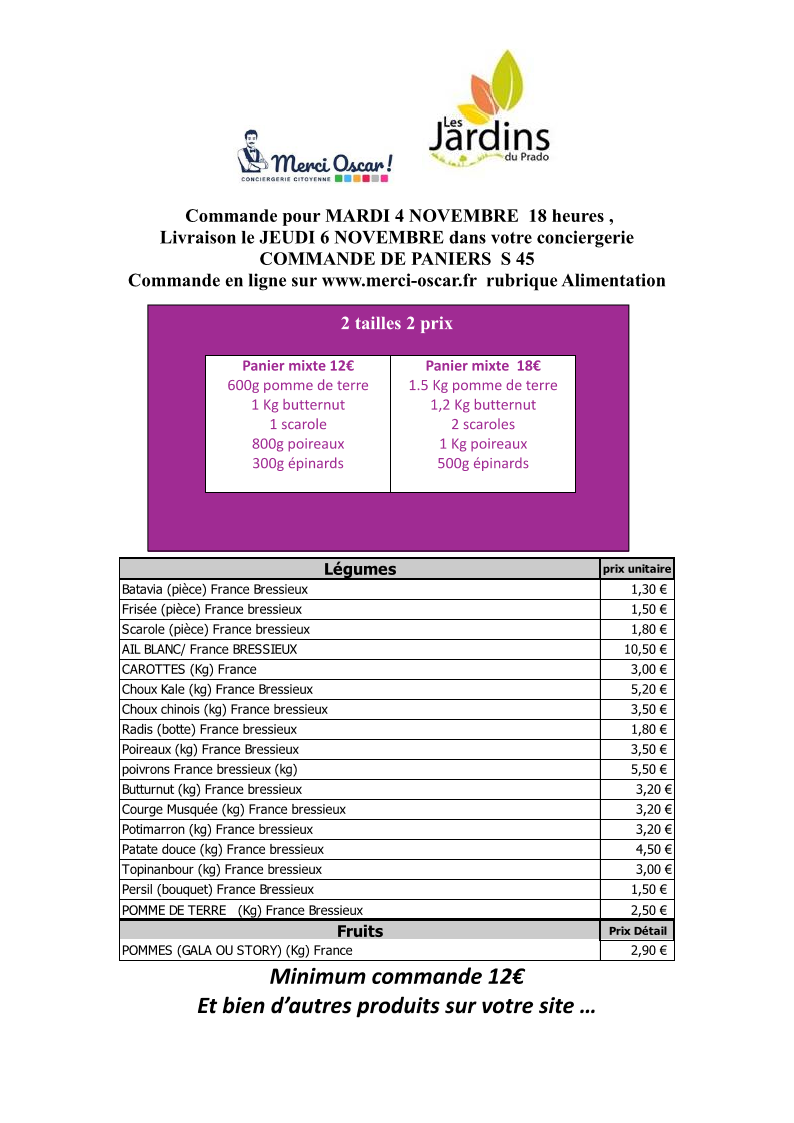 Commande du jeudi au mardi 18h. Livraison vers 11h le jeudi sur votre conciergerie.