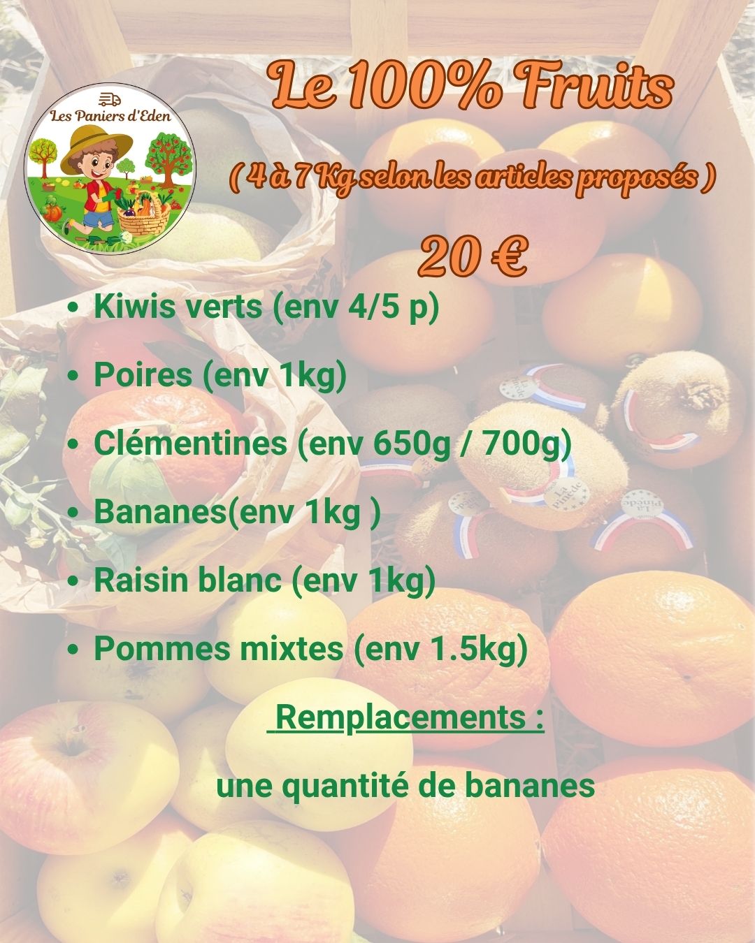 - Le 100% Fruits à 20€ : composé de 5-8 articles en fonction des produits proposés