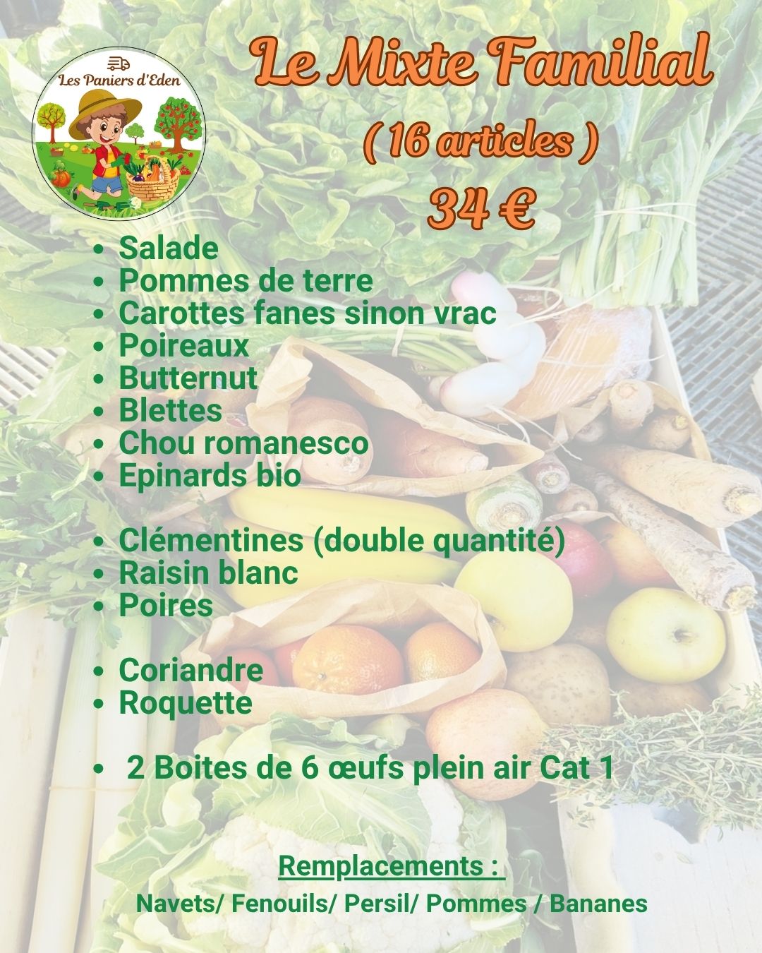- Le Mixte Familial à 34€ : un panier mixte composé de 16 articles dont une ou deux boîtes de 6 œufs plein air